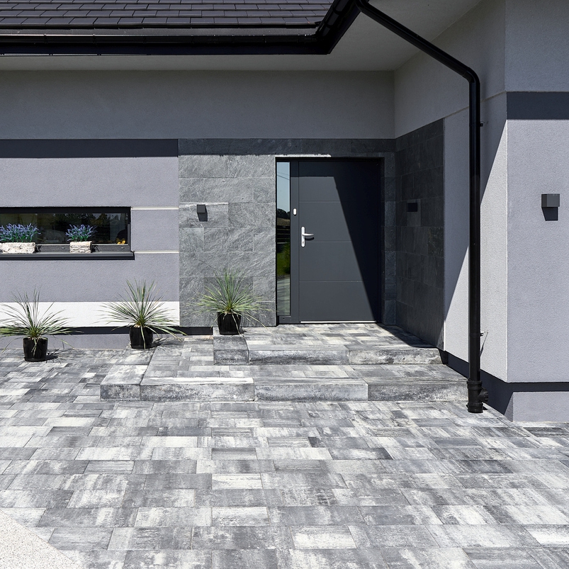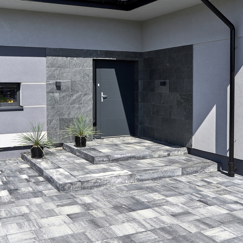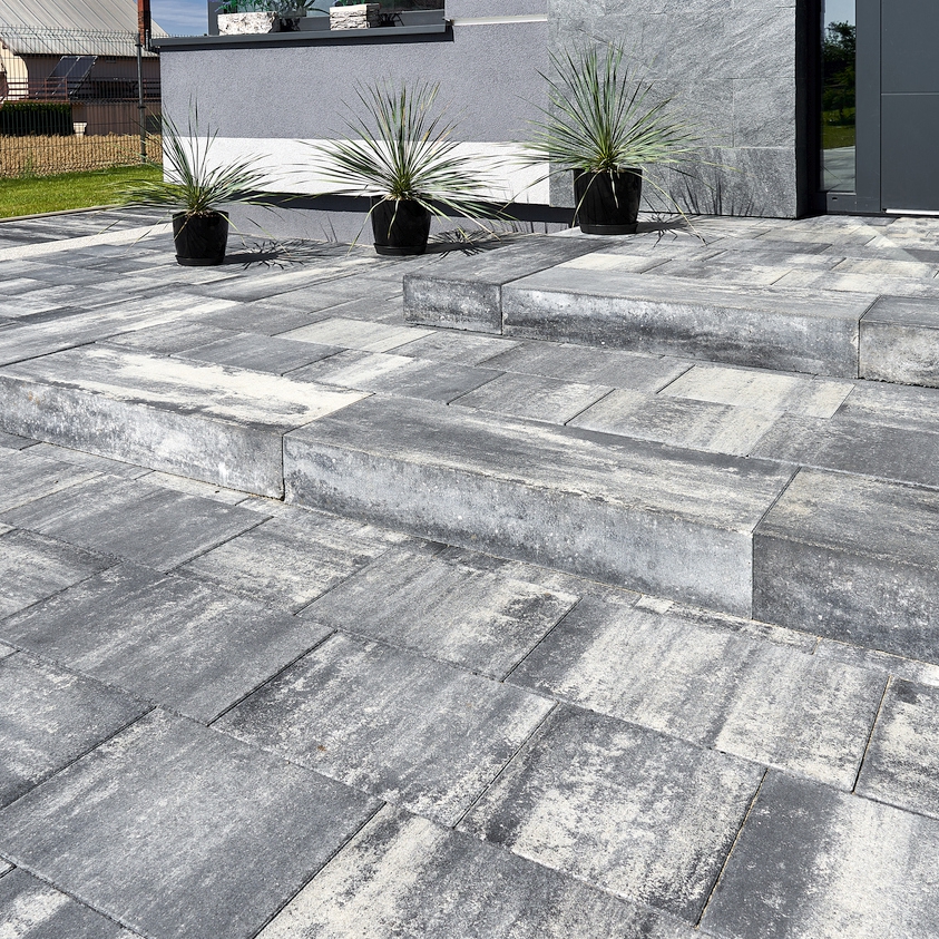 Stopnie Gładkie służą do budowy prostych biegów schodów terenowych, wejść do budynków czy obrzegowań tarasów. Oferowane są w modnych szarościach i popularnych ciepłych kolormixach zgodnymi z paletami barw naszych kostek brukowych. Bloki są hydrofobizowane i impregnowane. Krawędź górna zakończona jest mikrofazą.